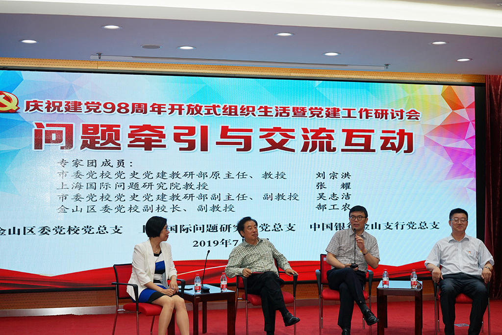 在问题牵引与交流互动环节,来自区级机关的4位党员和党务干部分别就“党员如何提高政治站位,正确看待中美贸易战”“企业党建工作如何与业务工作融合发展”“机关党建如何打造特色品牌”“面对居民区人口结构多元化,基层党组织如何提升组织力和号召力”等问题与困惑,向上海市委党校刘宗洪教授、上海国际问题研究院张耀教授、上海市委党校党史党建教研部副主任吴志洁、金山区委党校副校长郜工农4位专家进行请教,4位专家分别作了精彩、精准的答疑解惑。