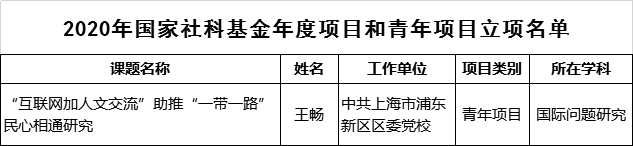 本网讯 近日,全国哲学社会科学工作办公室发布了关于2020年国家社科基金年度项目和青年项目立项名单的公示,浦东新区区委党校(行政学院)青年教师王畅的课题《“互联网加人文交流”助推“一带一路”民心相通研究》获得青年项目立项。这是浦东新区区委党校(行政学院)继2019年两项国家社科基金年度项目立项后的又一硕果。