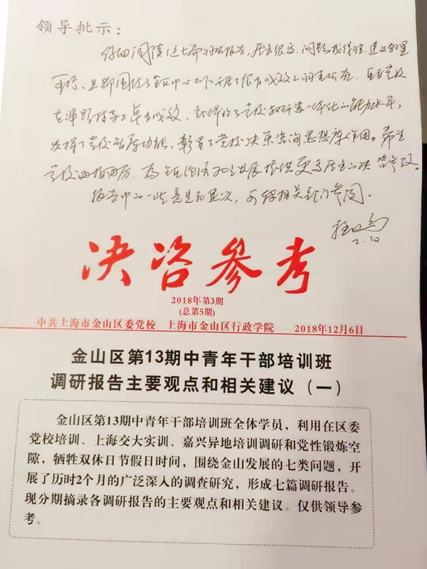 本网讯 近日,金山区委党校(区行政学院)《决咨参考》2018年第3期(总第5期)刊发的文章《金山区第十三期中青年干部培训班调研报告主要观点和相关建议(一)》,获得金山区委副书记、党校校长程鹏的批示与充分肯定。