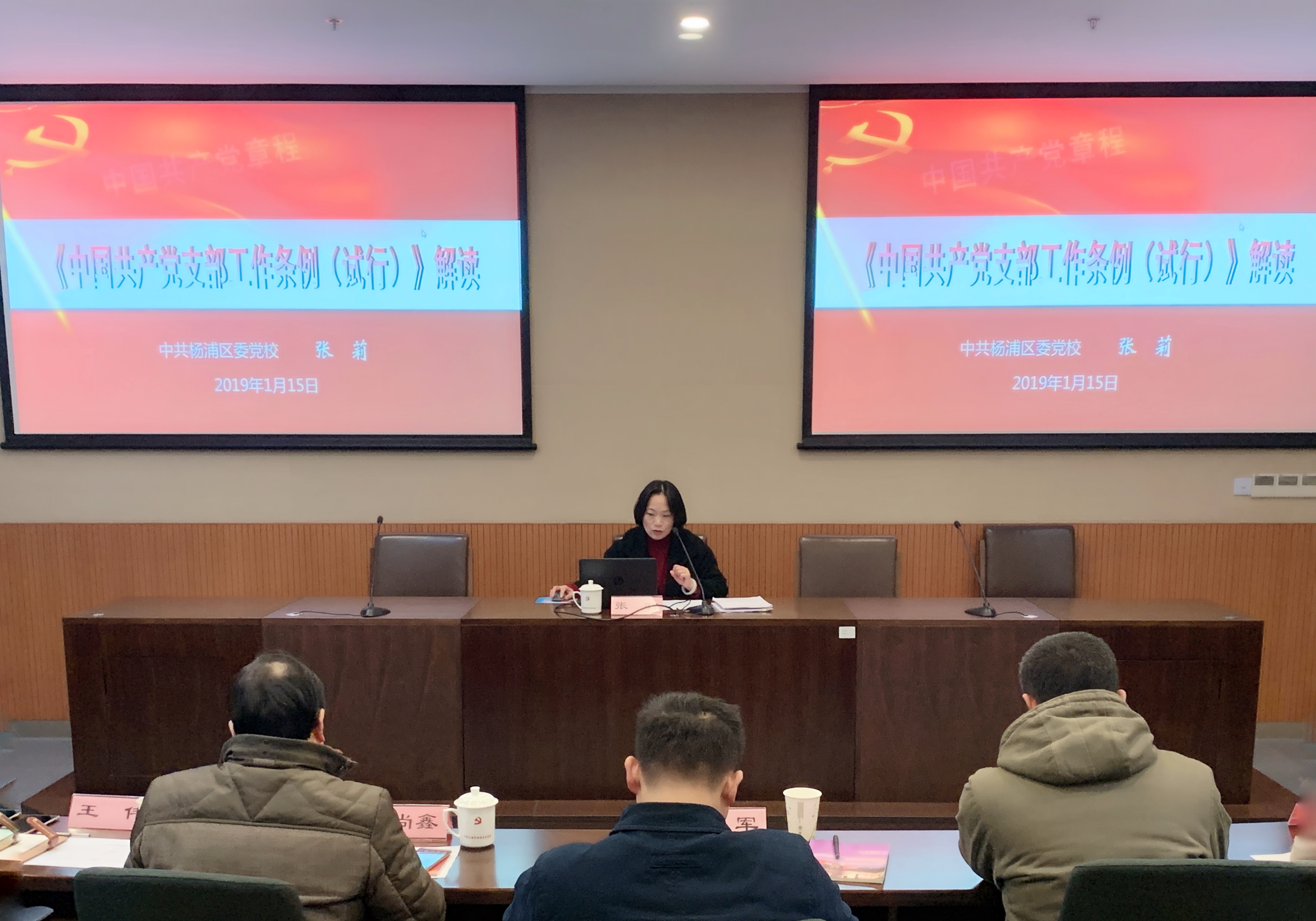 本网讯 为在2019年更好地以支部建设推动杨浦区委党校发展,以政治统领引领前进方向,1月15日下午,杨浦区委党校机关党支部组织全体教职工开展了《中国共产党支部工作条例》(简称《条例》)专题学习会,常务副校长张莉作辅导报告。