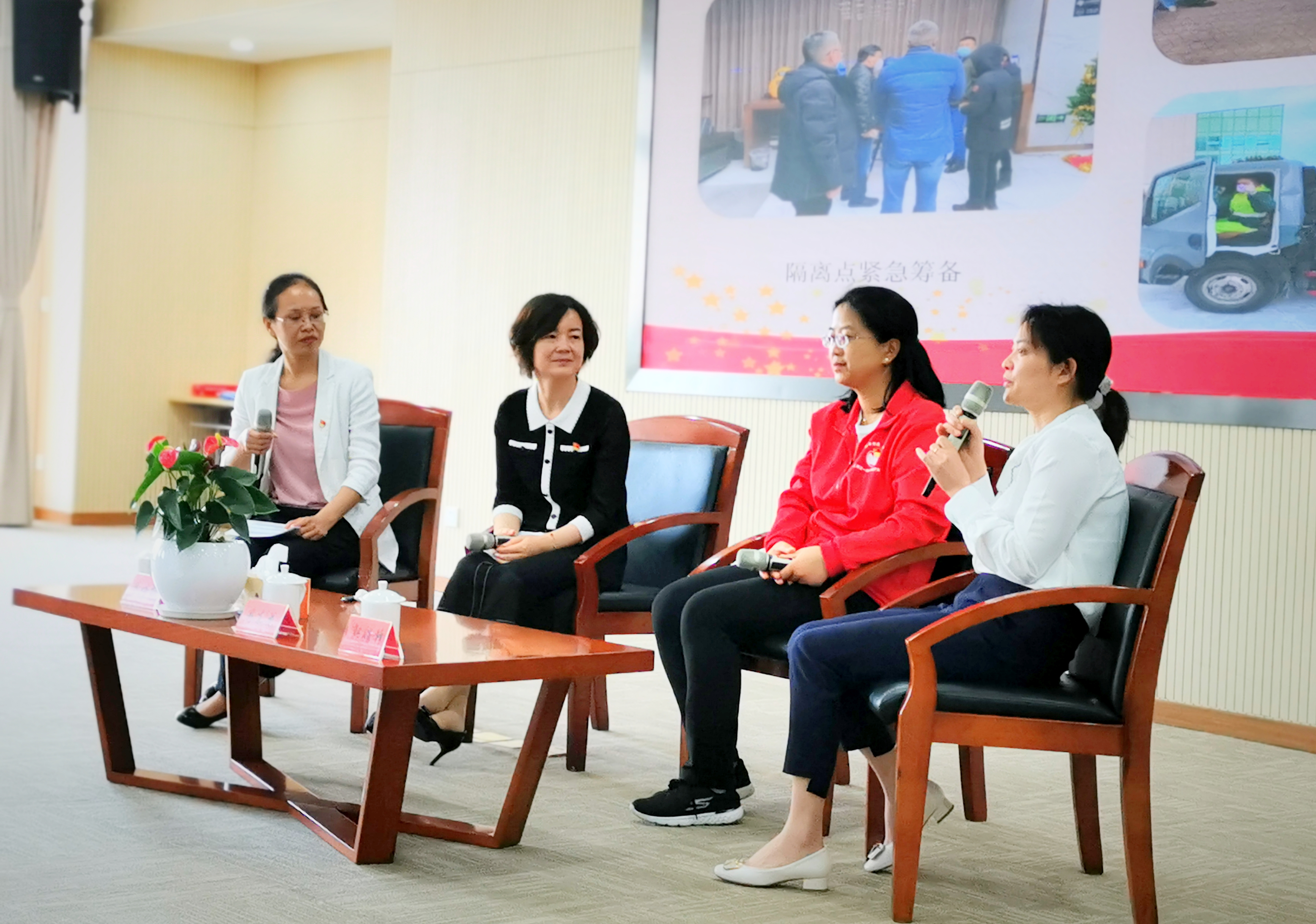 在访谈过程中,访谈嘉宾蔡培红讲述了区卫健委坚持全区一盘棋,协调医疗资源,统筹做好疫情防控和复工复产服务保障工作等安排部署,分享了为援鄂医疗队提供后勤保障工作中的点点滴滴,畅谈了疫情至今的切身体会和感受。周东花是奉贤援鄂医疗队唯一一位在重症监护室的医生,她为大家讲述了在金银潭医院救治病人的情况,分享了5位火线入党的最美逆行者的感人事迹,以及援鄂期间家人、组织、社会各界的关怀。郭娟锋担负着全区社区卫生服务中心管理工作,主要负责筹建全区集中隔离点,她跟大家分享了隔离点筹备时遇到的困难、隔离人员的管理以及隔离点工作人员的工作情况等。