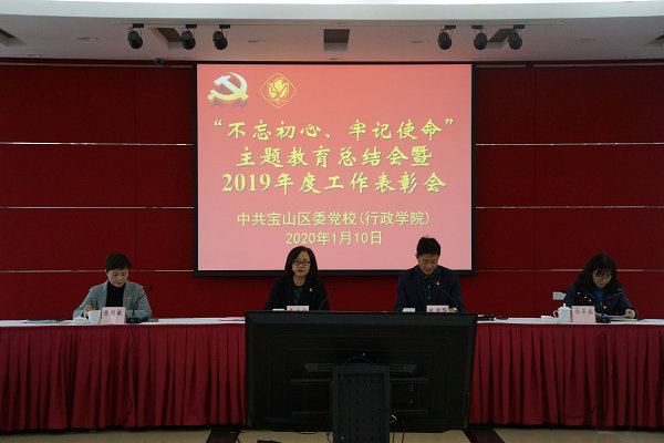 本网讯 1月10日,宝山区委党校(行政学院)召开“不忘初心、牢记使命”主题教育总结会暨2019年度工作表彰会,党总支书记、副校长陈苏华主持,区委第六指导组余翠英同志列席指导,全体教职工参加。