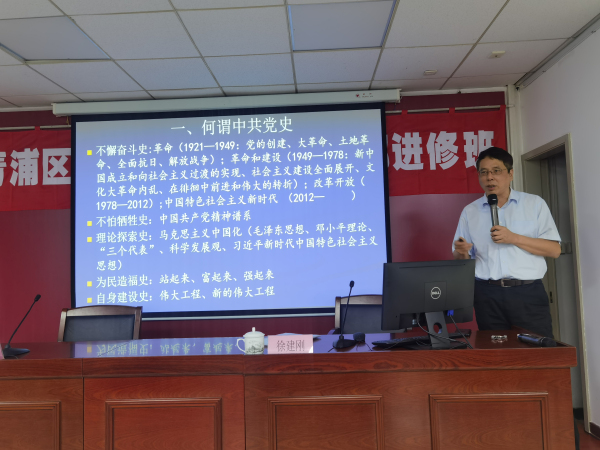 本网讯 9月26日下午,青浦区委党校邀请上海市委党校常务副校长徐建刚为青浦区处级领导干部进修班学员作“如何把握党史的主题和主线——以党的三个历史决议为线索”专题报告,区委党校常务副校长陈菊英主持。