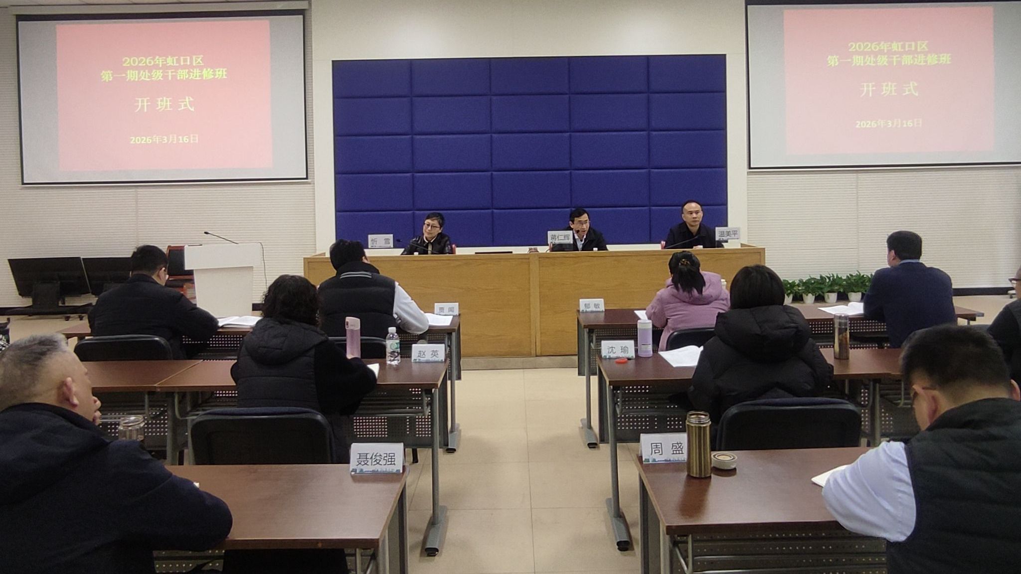 3月16日,2026年虹口区第一期处级干部进修班开班,区委常委、组织部部长蒋仁辉出席并讲话。区委党校常务副校长温美平宣布教学计划及有关事项,副校长忻雪主持开班式。