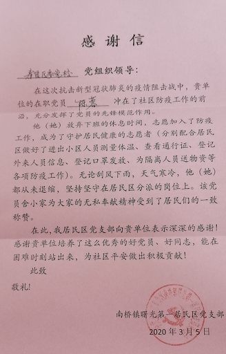 在这场战“疫”中,我虽无力奔赴主战场,但是我可以尽我所能为疫情防控贡献自己的力量,这一刻我不是一名刚参加工作半年的新人,而是一名拥有近一年半党龄的党员,我要用我的实际行动践行我的初心和使命。我坚信,只要我们同心协力、英勇奋斗、共克时艰,就一定能夺取疫情防控阻击战的全面胜利!